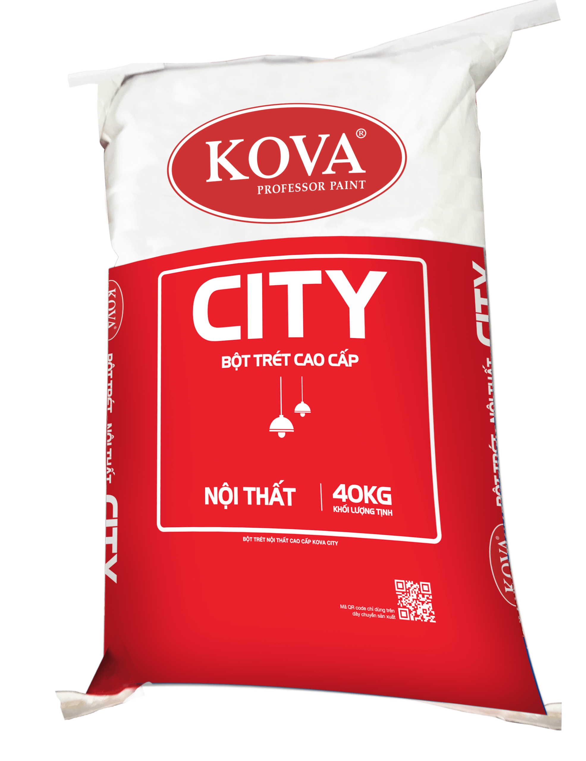 Bột trét nội thất cao cấp KOVA CITY – sản phẩm chuyên dụng cho trong nhà, giúp che lấp khuyết tật, tạo bề mặt phẳng mịn, tăng độ bám dính cho lớp sơn phủ và mang lại vẻ đẹp bền lâu.